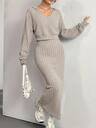 2-częściowy komplet z dzianiny prążkowanej na jesień/zimę: luźna bluza z kapturem + długa spódnica z wysokim stanem i dopasowanym krojem, modny, swobodny strój wyszczuplający