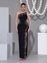 Noua rochie neagra lucrata manual, cu margele si strasuri 3D, cu umeri, cu umeri, eleganta pentru invitati la nunta, petrecere de vacanta, rochie de seara formala