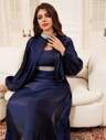 Rochie elegantă de lungime medie, model arab, guler înalt, mânecă lungă, detaliu cu nasturi, material textil floral, potrivită pentru ocazii speciale