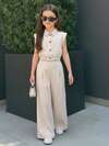 Firerie Kids Set 2 piese casual pentru fete preadolescente, culoarea caisă, cu talie strânsă, tricou cu guler polo, vestă și pantaloni lejeri, versatil pentru purtare zilnică, naveta, ședință foto
