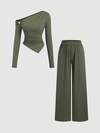 Coolane Women's Daily Wear Essentials Knit Stretchy Comfy Asymmetrical Neck Long Sleeve Tops And Wide Leg Sweatpants Tracksuit Two Pieces Outfits