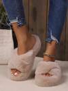 New Plush Slippers Autumn/Winter Outdoor Wear, Fluffy Thick Bottom Cute Ins Style Slip-On Cozy Warm Cross Strap Flat Open Toe Slippers For Women,Furry Shoes