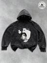 Men's Autumn And Winter Pattern Hooded Sweatshirt Top, Slightly Stretchy And Fitted, Washed And Distressed, Plush And Cotton Black Long-Sleeved Cardigan Zipper Sweatshirt, Casual Everyday Back-To-School Season Jacket