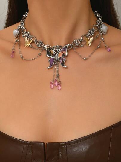 1pc Y2K Chinese Punk Subculture Charm Butterfly & Heart Pendant Necklace, Thick Chain Layered Design, Suitable For Women's Party, Music Festival, Daily Wear, Gathering - Multicolor - View 1