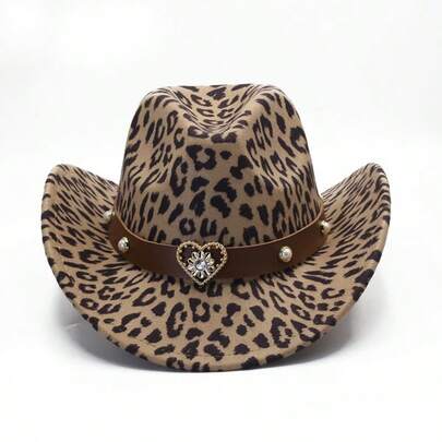 1pc Leopard Print Western Cowboy Hat, Made Of Felt Material With Detachable Heart-Shaped Decor Band, Printed Design, Suitable For Daily Wear And Halloween-Christmas Occasions - Leopard - View 1