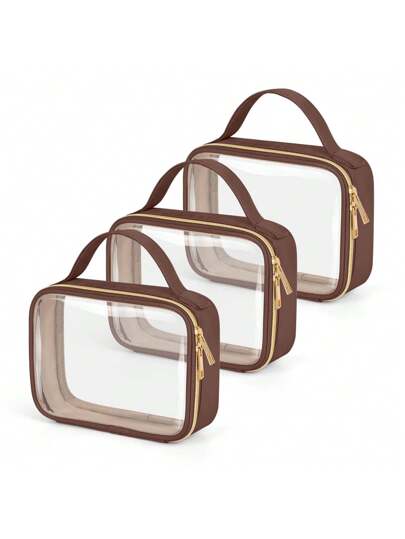 4Packs Clear Travel Makeup Bag, TSA Approved Toiletry Bag, Transparent Makeup Bags With Handles, Quart Size Clear Toiletry Bags, Double-Layer PVC Clear Cosmetic Bags For Women And Men, Carry On Airport Airline Compliant Bag. Wash Bag Bathroom Beach Beach Bag Vacation Holiday Essentials School Supplies Travel Essentials Ladies Dorm College Holiday Winter,For Holiday Beach, Bathroom Collection, Bedroom Collection, Large Capacity - Dark Brown - View 1