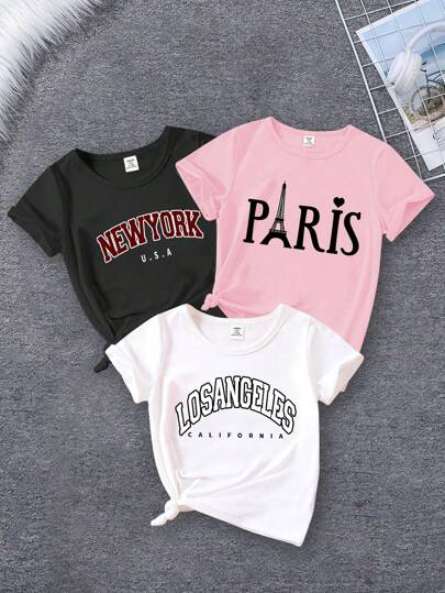 SHEIN Baby Girl Casual Cool City Slogan Print Fashionable Spring/Summer 3pcs Tops T-Shirt Set - Multicolor - View 3