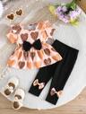 เสื้อเชิ้ตติดกระดุมด้านหน้าลายหัวใจน่ารักสำหรับเด็กผู้หญิงแรกเกิดและชุดกางเกงขายาวผ้าฝ้ายเรียบง่าย