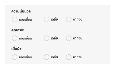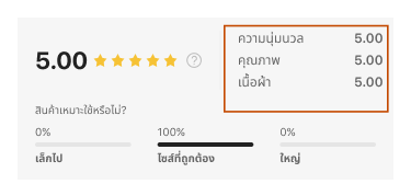 สำหรับผลิตภัณฑ์บางรายการ เราให้แอตทริบิวต์สำหรับการให้คะแนนจากหลายมิติ เพื่อช่วยให้คุณทราบเกี่ยวกับผลิตภัณฑ์ได้ง่ายและแม่นยำยิ่งขึ้น คุณสามารถให้คะแนนผลิตภัณฑ์ในด้านคุณภาพของผลิตภัณฑ์ การระบายอากาศ ความนุ่มนวล ใช้งานง่าย และด้านอื่นๆ เราจะคำนวณคะแนนเฉลี่ยโดยผู้ใช้ทั้งหมด คะแนนรวมคือ 5
