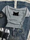 Attitoon เสื้อยืดแขนสั้นเข้ารูปเปิดไหล่ครอปสำหรับผู้หญิง สีเทา ลายแมวดำ สไตล์โกธิค สำหรับงานปาร์ตี้ วินเทจ พังก์ Y2K ใส่ได้หลากหลาย สำหรับเทศกาลดนตรี และเที่ยวฤดูร้อน