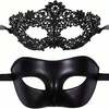 2 Parça Çift Parti Maskesi Seti, Kadınlar İçin Siyah Dantel Kraliçe Maskesi, Erkekler İçin Yarım Yüz Maskesi, Maskeli Balo, Karnaval, Romantik Tatiller, Gala ve Sevgililer Günü Aksesuarları İçin Uygundur