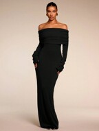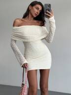 Selianne Kadın Düz Renk Yuvarlak Yaka Uzun Kollu Düşük Omuzlu Moda Örgü Kazak Elbise
