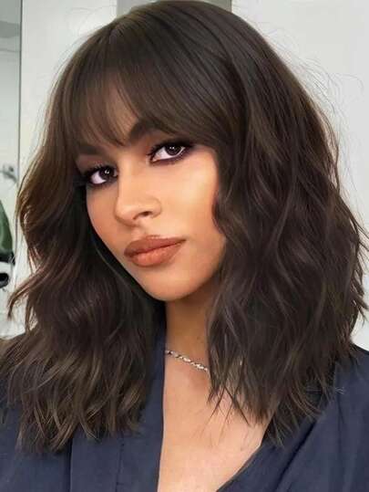 16inch HAIR Natural Brown Synthetic Curly Wavy Bob Wig With Bangs For Women - Brown - View 1