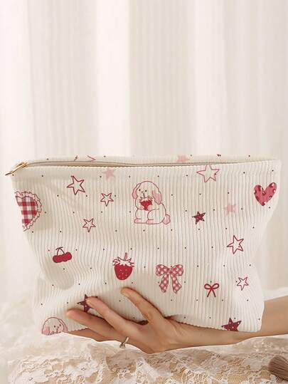 1pc Portable Makeup Bag With Bow, Star, Strawberry Pattern Double-Sided Print, Zipper Travel Cosmetic Pouch, Multi-Functional Toiletry Organizer - Multicolor - View 1