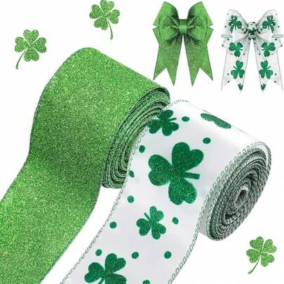 2 Rolls, St. Patrick's Day Wired Edge Ribbon, 2.5 Inches Wide, Lucky Clover Pattern, Craft Ribbon For DIY Wreath Bow Wrapping Gift Decoration - Green - View 1