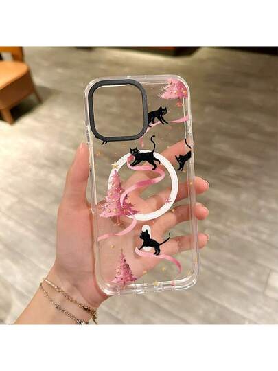 A Group Of Black Cat Fans Christmas TreePatterned Transparent Acrylic Magnetic Phone Case Compatible With IPhone 16 Pro Max/16/15/14/13/12. It's An Ideal Gift For Christmas And Valentine's Day, Perfect For Boyfriends, Girlfriends, And Family. - White - View 1