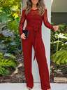 ChicMe Women Rhinestone Scallop Trim Deep V Neck Lace Spliced Jumpsuit High Waist Zipper Back Straight Leg Overalls Chic Party Cocktail