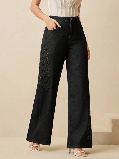 Anewsta Tall Elegant Embroidered Black Straight-Leg Jeans For Women - Black - View 1