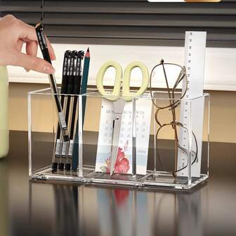 1pc Desktop Clear Pen Cup, Makeup Brush Holder, Vanity Desk Organizer For Cosmetic Products, Lipstick & Pens, Elegant Style, Suitable For Back To School Season