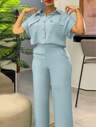 2pcs/Set Solid Color Lapel Front Button Short Sleeve Top And Long Pants, Casual Plus Size Summer Outfit