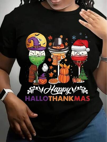 Plus Size, Women's Halloween & Christmas Graphic T-Shirt - Happy Spooky Holiday Party Tee - Black Casual Crewneck Top - Machine Washable Plus Size Shirt For Halloween Thanksgiving Christmas Celeb - Black - View 1