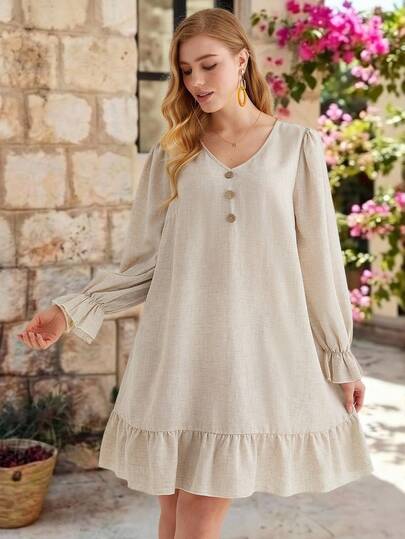 Parysyn Plus Size  Elegant Women's Mini Dress With Ruffle Trim And Lantern Long Sleeves V Neck Button Front Summer Flowy Short Dress Comfy Dress Tunic Dress Linen Dress For Women Long Sleeve Summer Dress Cottagecore Dress Tunic Dresses Ruffle Hem Dress Linen Dresses For Women Beige Dress For Women French Style Dress - Apricot - View 1