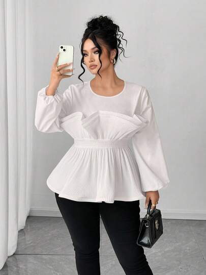 Elenzga Plus Size Pleated Ruffle Collar Belted Solid Color Long Sleeve Blouse For Women - White - View 1