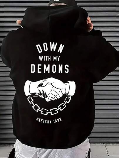 Popular Hoodies For Girls Women's Black Hoodie - MY DEMONS Chain Pattern Pullover, Heavyweight Street Style Sweatshirt For Autumn And Winter, Hooded Design, Casual Outfit For Autumn And Winter, Bold Print, Comfortable Fit Roomy And Comfortable - Black - View 12