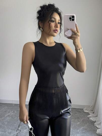 Elenzga Summer Fashion Solid Color Fringe Hem Tank Top - Black - View 1