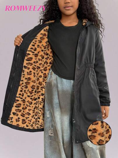 Tween Girl Leopard Print Thermal Lined Hooded Jacket, Autumn/Winter Fall - Multicolor - View 8