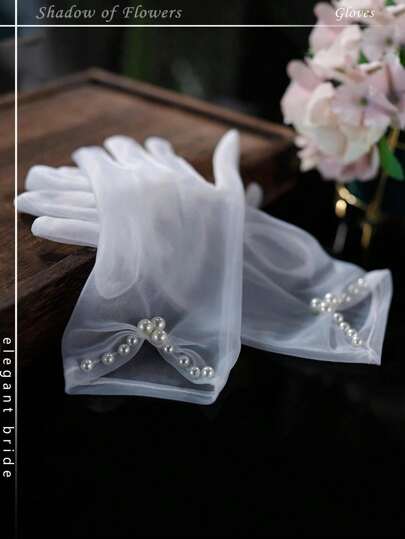 White Elegant Bridal Gloves, Decorated With Faux Pearls, Suitable For Ladies' Wedding Or Ball Wear, Short Full Finger Sheer Gloves, Autumn Accessory - White - View 1
