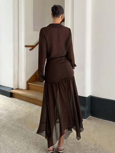 Siren Gaze Women's Elegant Office Commute Minimalist Solid Color Semi-Sheer Long Sleeve Blouse And Pleated Asymmetric Hem Skirt 2-Piece Set, Spring/Autumn - Brown - View 1