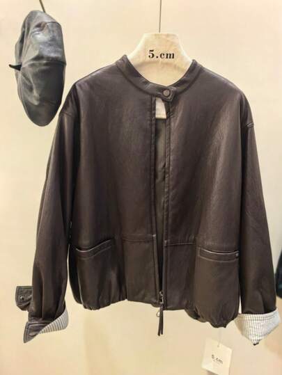 Women's Solid Color Front Zipper Casual Vacation Faux Leather Jacket - Coffee Brown - View 1