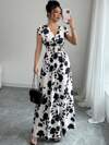 Elenzga Women V-Neck Allover Print Casual Long Dress