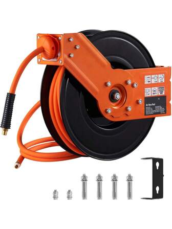 3/8 IN X 50 FT Retractable Air Hose Reel: Max 300PSI Hybrid Hose With 5 Ft Lead-In, Heavy-Duty Double Arm Steel Reel For Ceiling/Wall Mount - Ideal For Air Compressors