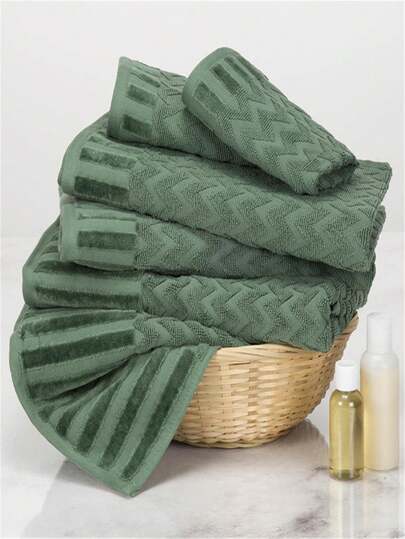 <p>Wrap yourself in these soft, super absorbent, sculpted towels featuring a modern twist on a traditional look. This chevron towel set will add contemporary style to any bathroom decor. </p><b>Features</b><ul><li>Soft, sculpted fabrication</li><li>Machine washable</li><li>6 Piece</li></ul><b>Care Instructions</b><ul><li>Wash before first use, machine wash gentle, use on non-chlorine bleach if needed, tumble dry on low heat, remove promptly.</li></ul><b>Set Includes</b><ul><li>2 Bath towels, 2 hand towels, 2 washcloths.</li></ul><b>Specifications</b><ul><li><b>Color:</b> Green</li><li><b>Material:</b> 100% Cotton</li><li><b>Bath Towels:</b> 27 x 54 in.</li><li><b>Hand Towels:</b> 16 x 28 in.</li><li><b>Washcloths:</b> 13 x 13 in.</li><li><b>Weight:</b> 3.3 lbs</li></ul>